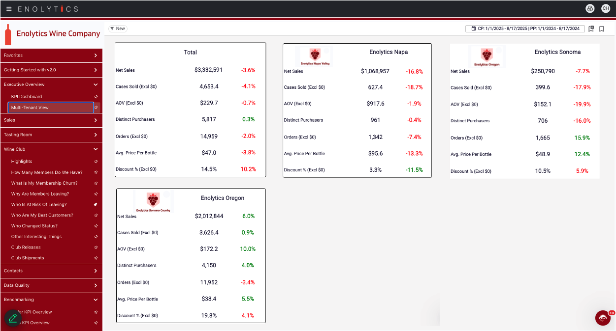 Our multi-tenant capabilities remove the heavy lifting of manually retrieving and aggregating data from disparate sources and eliminates significant margins of error, stale data and hours upon hours of effort. Your brands can exist on different wine datasets or tenants (Wine Direct, Commerce7, VinSuite or eCellar), it doesn’t matter.