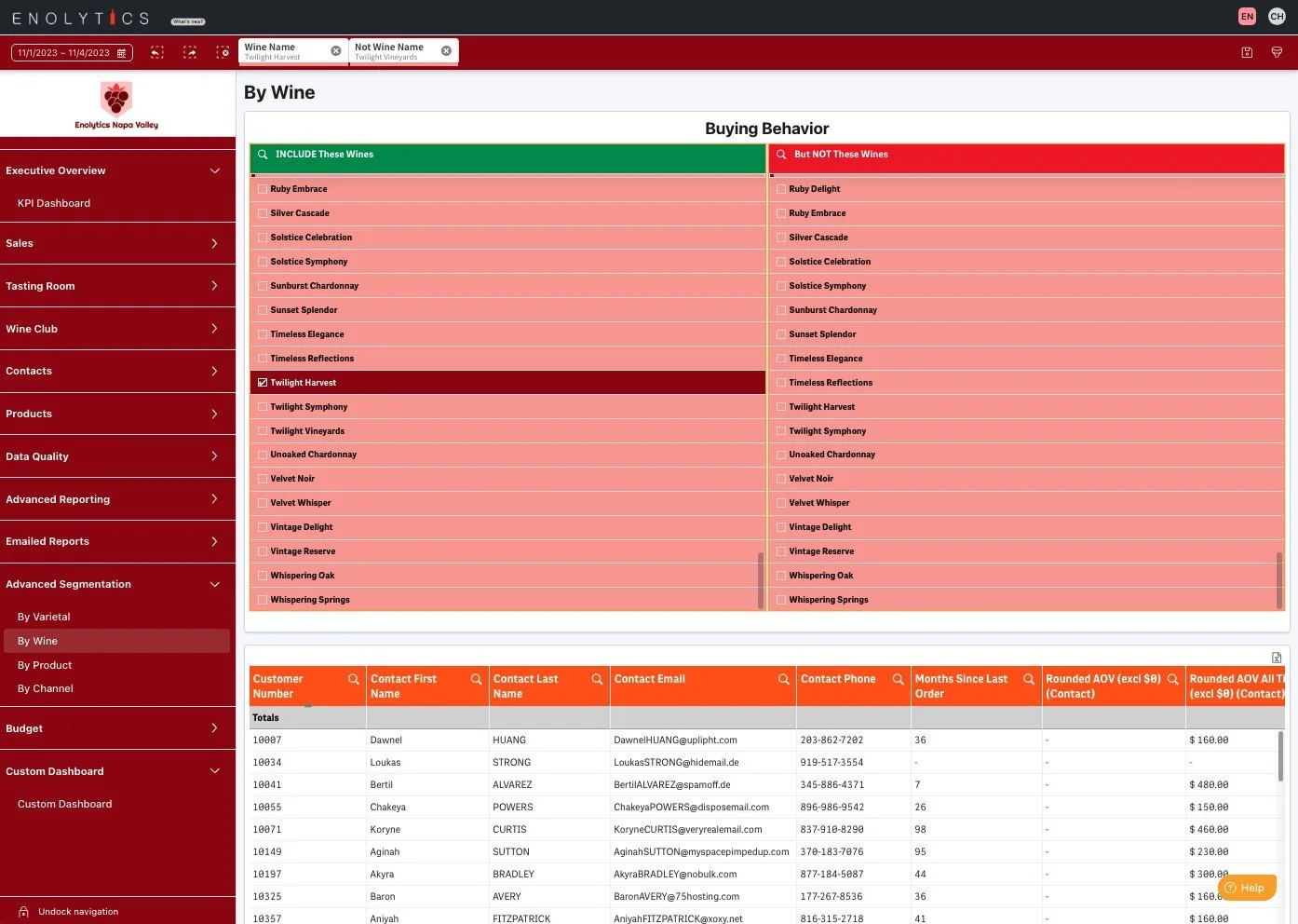 Identify customers who did one type of behavior but not another. For example, Wine Club customers who never visited your Tasting Room. Or customers who bought one vintage of wine but not the current vintage.