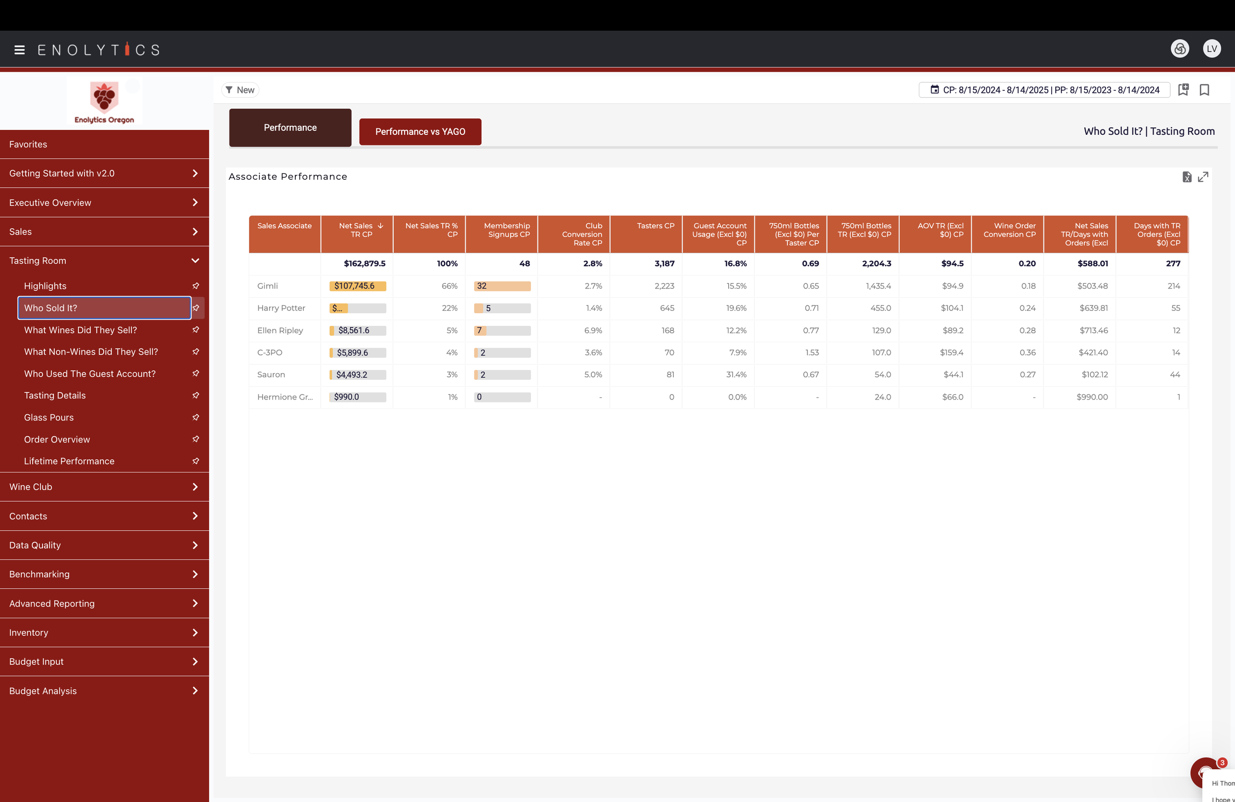 Drill down into specific options including Channel (Tasting Room, Club, Ecommerce) and Sales Associate.