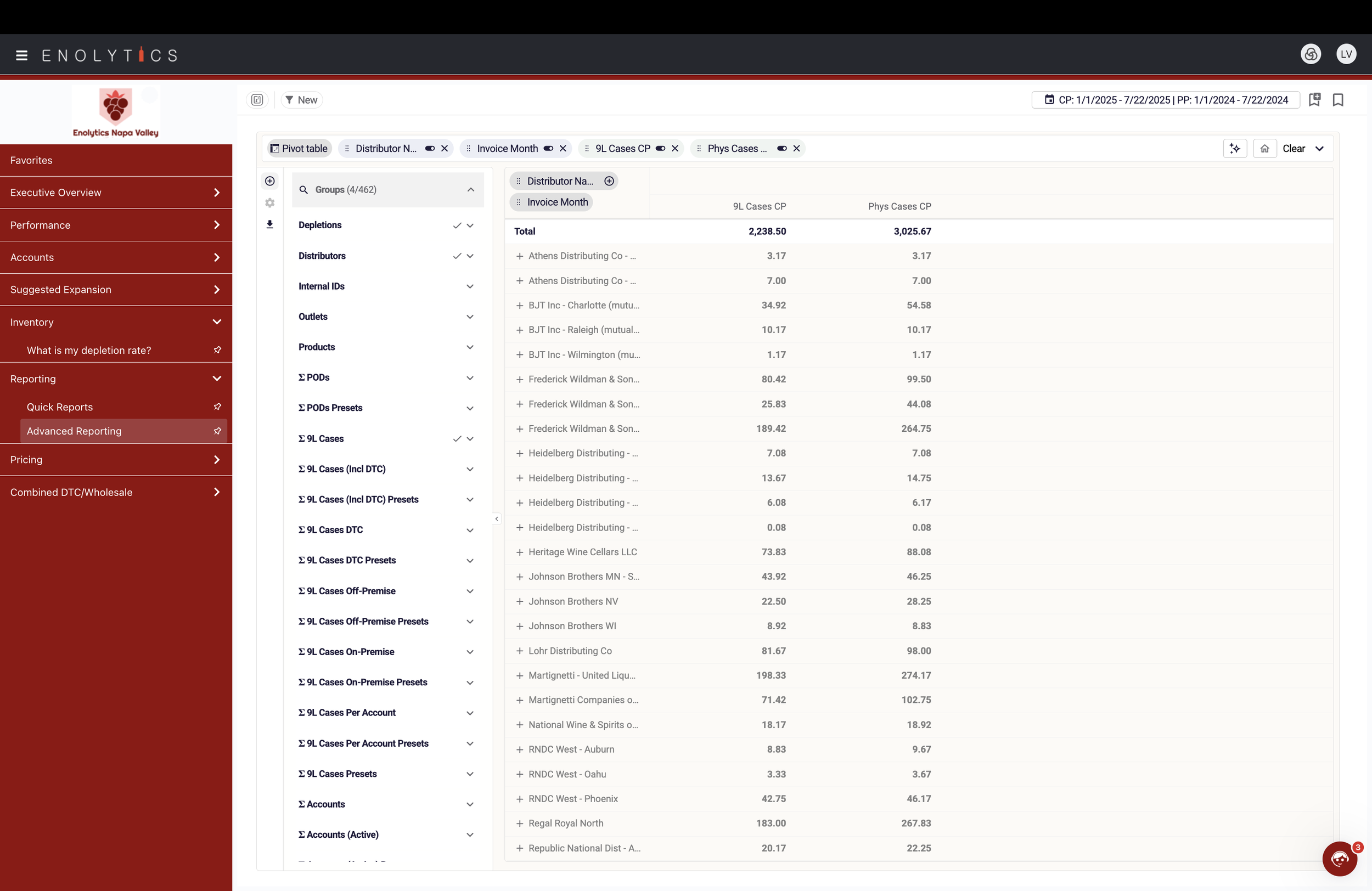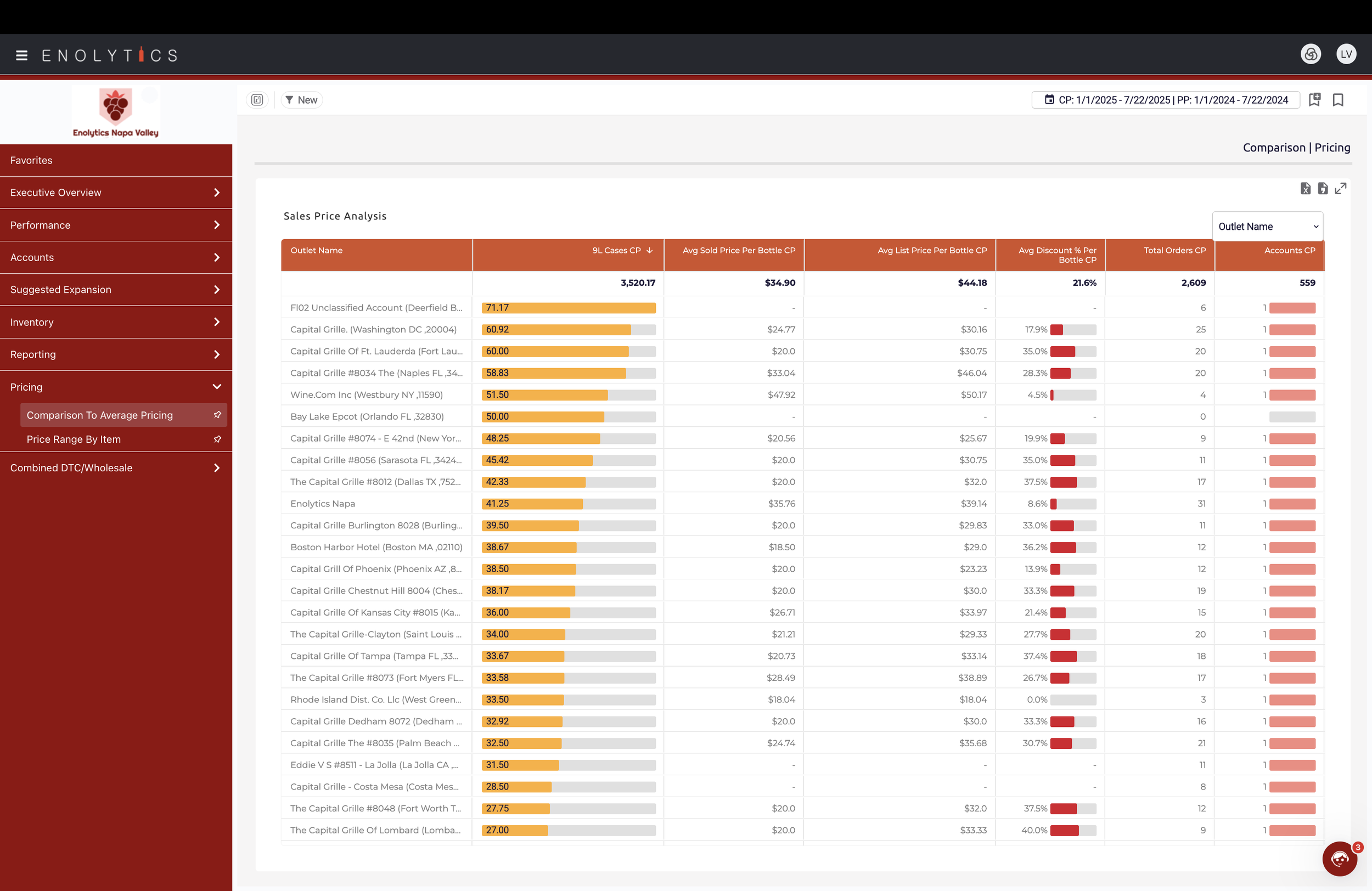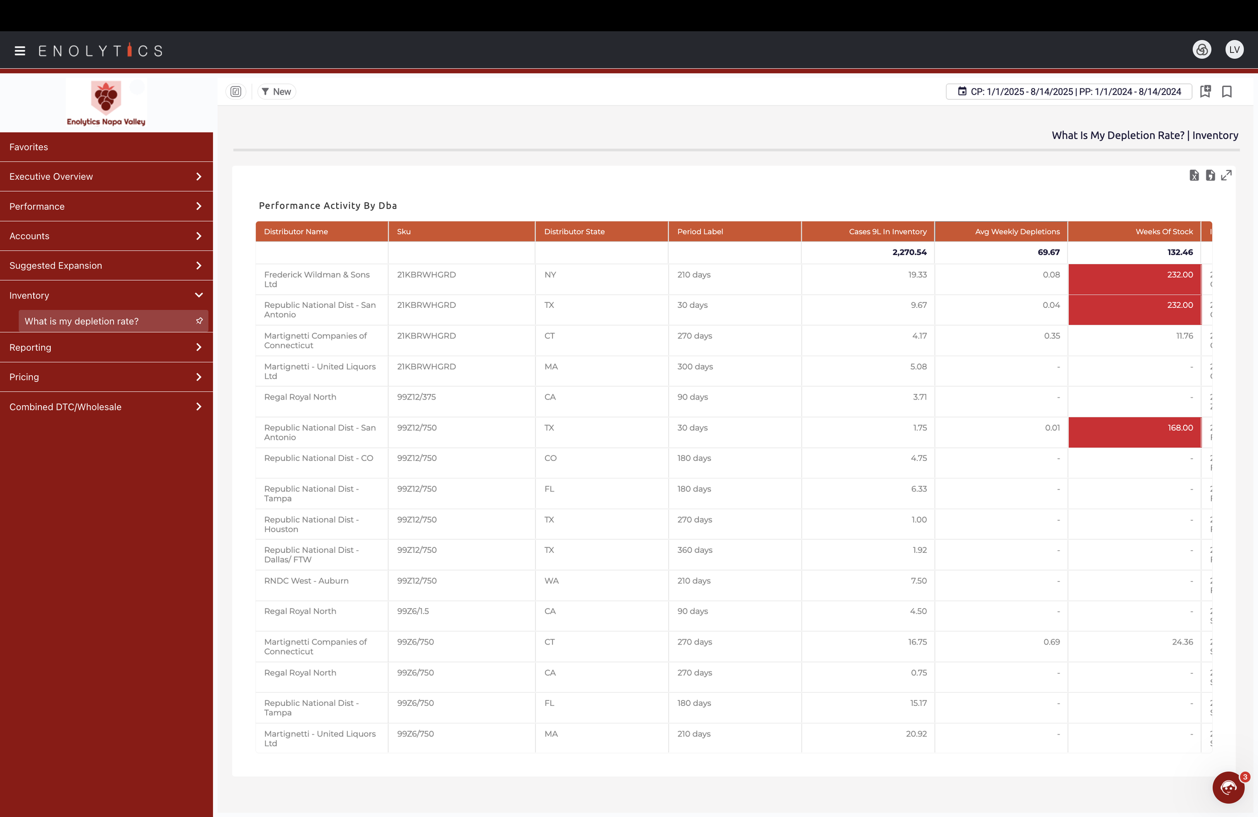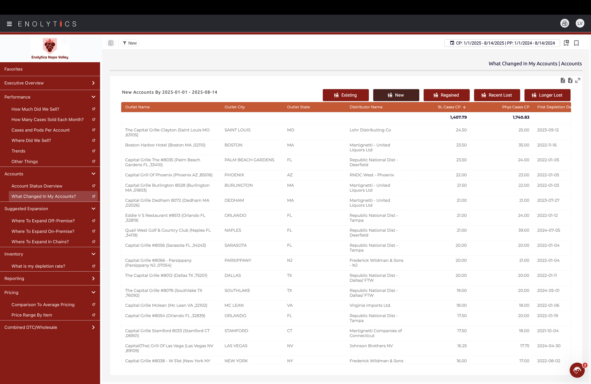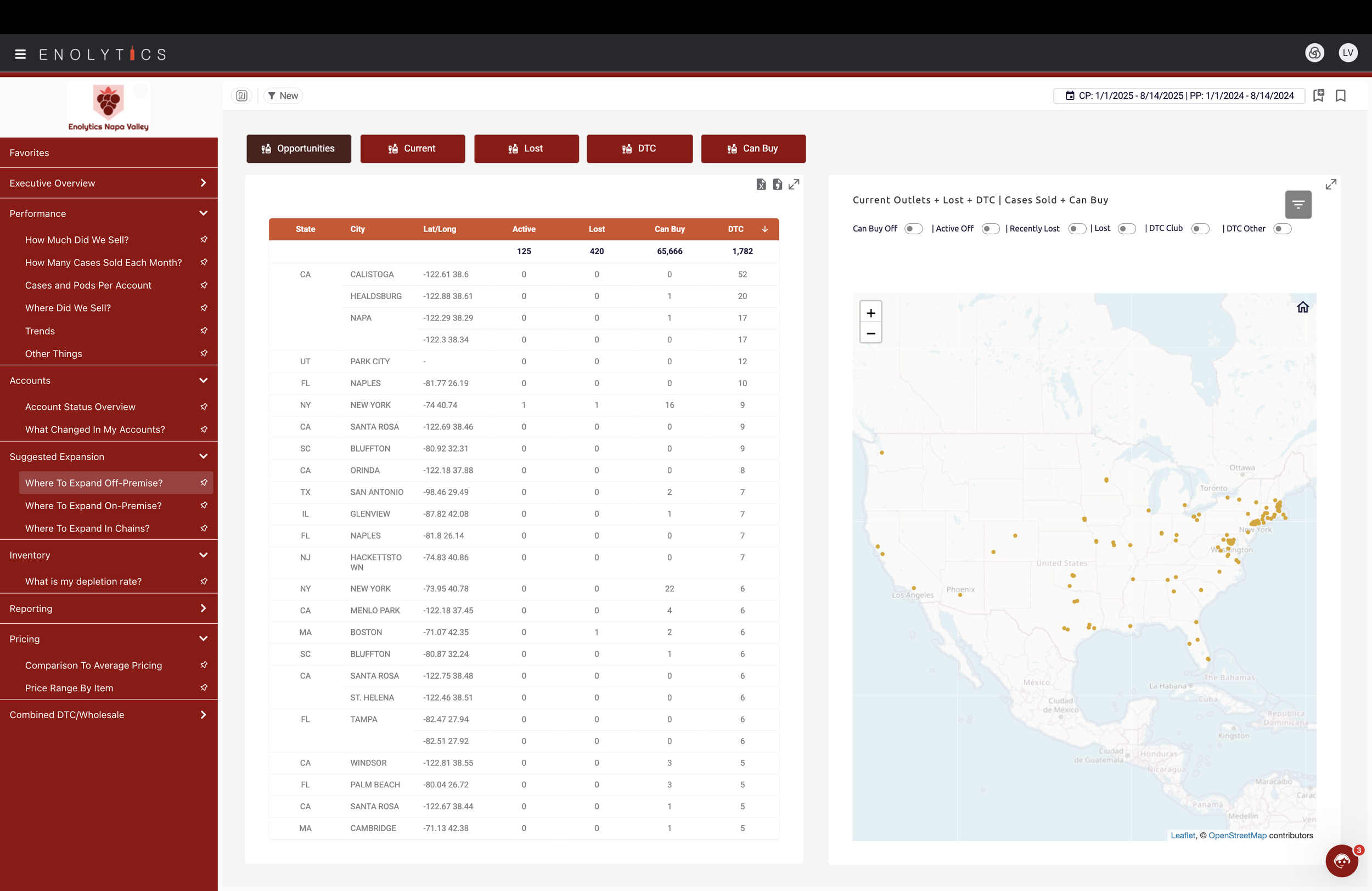 Through an industry-leading partnership with VIP, Enolytics gives you a 360 degree power view of your sales data across all distributors, combined with DTC wine and geographic insights, so you can increase sales velocity, retain key accounts, and pinpoint high-value new opportunities. Stop guessing and get clarity on which accounts and chains to target, thus empowering your distributors with the industry intelligence they need to sell your wines.